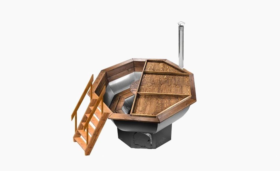 Банный чан на дровах из нержавеющей стали марки Aisi 304. Вмещает в себя до 4х человек. Толщина стенок чаши 2мм, толщина дна 3мм. Отделка и лестница для банного чана изготовлена из лиственницы. Это прочное, влагостойкое дерево устойчиво к гниению. Для увеличения срока службы древесины мы обрабатываем её Сенежем. Печь - подставка изготовлена из стали 2мм, дно печи сделано из стали 6мм, колосник 20мм. В печи предусмотрен зольник. Дымоход сделан из нержавеющей стали. Внешняя часть банного чана покаршена чёрной термостойкой краской. Банный чан - это буквально горячий источник на вашем дачном усаствке. Вы можете париться в нём круглый год невзирая на погоду. Довольно часто в чан добавляют эфирные масла или травы для более приятного и полезного эффекта от парения.