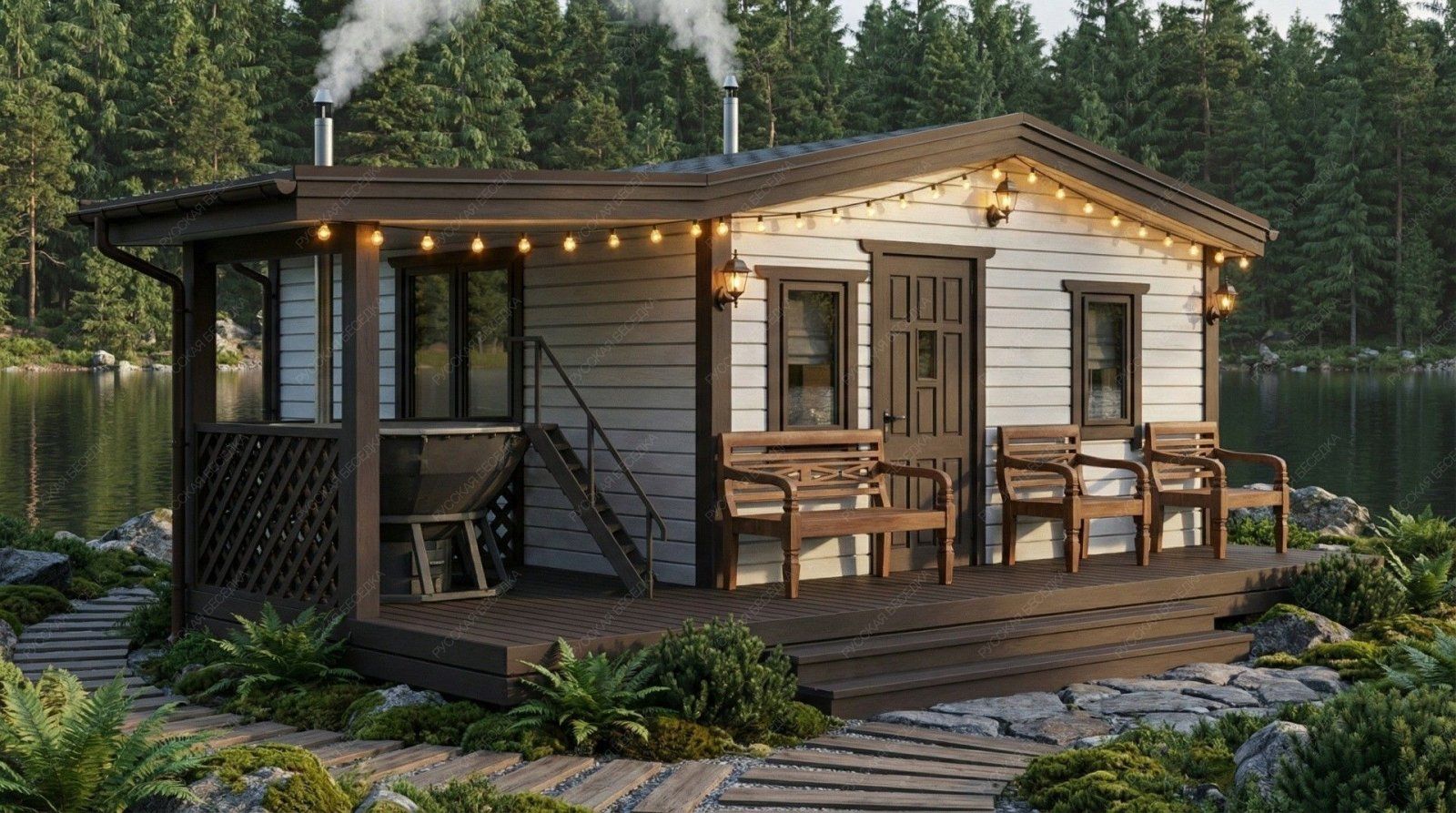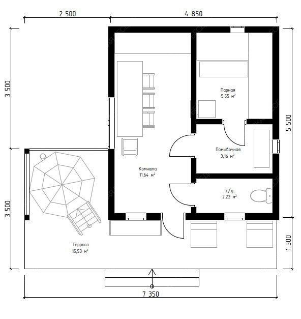 Баня «Велма» выделяется продуманной архитектурой, где открытая терраса становится многофункциональным пространством для полноценного отдыха. Ее ключевая особенность — специально предусмотренный выступ на просторной площадке (15,53 м²), идеально подходящий для установки банного чана, что позволяет создать полноценный СПА-комплекс под открытым небом.  Внутренняя планировка построена на принципах удобства и функционального разделения. Просторная комната отдыха (11,64 м²) создает атмосферу для приема гостей, а наличие отдельного санузла значительной площади (2,22 м²) добавляет бытового комфорта. Классическая парная (5,55 м²) с окном-форточкой и изолированная помывочная обеспечивают правильный микроклимат и гигиеничность процедур. Надежная двускатная крыша и общие габариты (4,85х5,5 м) формируют солидный и традиционный экстерьер строения.  Использование качественных материалов и точный конструктив гарантируют долговечность и эффективное теплосбережение. Данный проект предлагает комплексное решение, где удачно сочетаются классическая банная культура и современные элементы оздоровительного отдыха, делая террасу с чаном логическим центром притяжения всего строения.