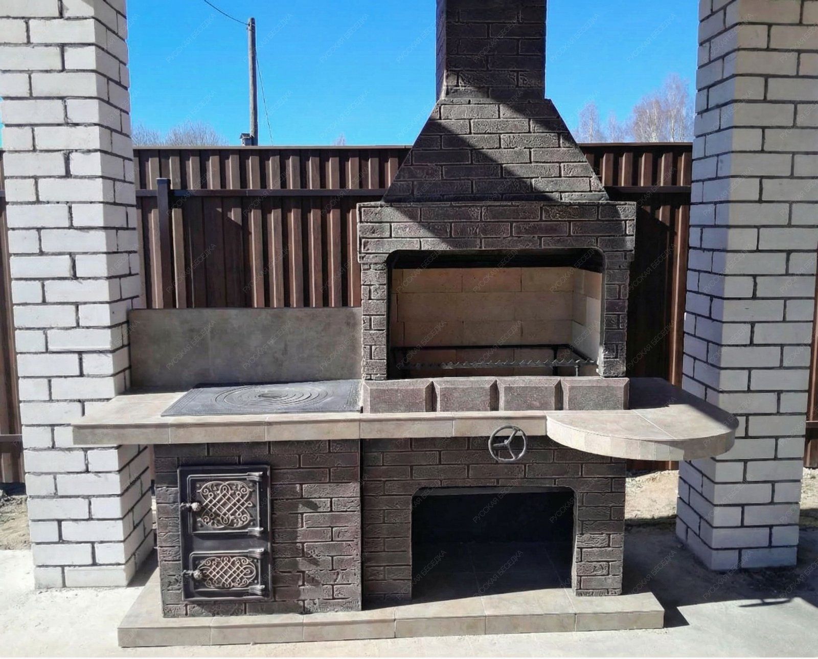 • Расширенная просторная топка, отделанная огнеупорным кирпичом. Она дополнена продуманной металлической решеткой. Последняя приспособлена для использования шампуров, гриль-решеток и разной посуды.