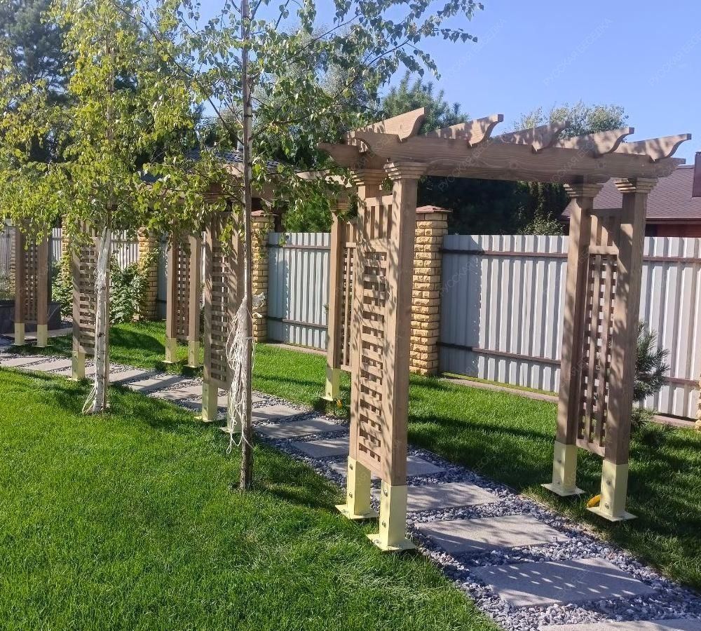 Деревянная пергола придаст вашему садовому участку теплую и уютную атмосферу.Также пергола может служить опорой для плетущихся растений - только представьте, как приятно находиться в окружении цветущего клематиса или пышных роз! Дополнительные элементы, такие как встроенное освещение, декоративные решетки, качели или скамейки, могут усилить визуальный эффект и создать еще более комфортное пространство. А если в конструкцию перголы добавить подиум, то он может служить местом для расслабления или стать сценой для семейных мероприятий.