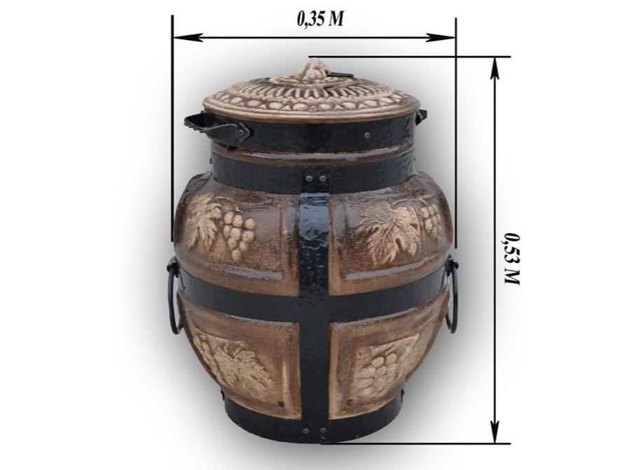 "Барельеф" не только удобная и функциональная керамическая печь, его внешнему виду уделено много внимания. Поверхность украшена рельефными орнаментами и элементами из металла. Такой тандыр станет прекрасным украшением для вашего загородного участка.
