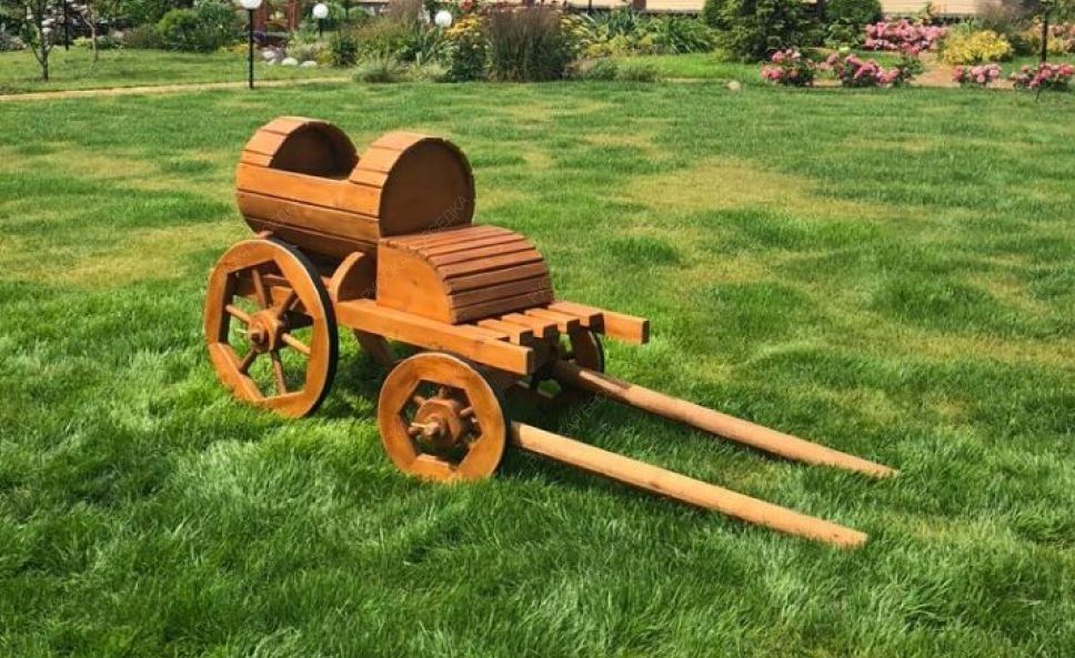 Современные садоводы достаточное время уделяют красоте своего участка. И понятие ландшафтный дизайн с каждым годом всё ближе и ближе к обычным дачникам. Излюбленный предмет, который можно поставить в любое место в саду, конечно же, деревянная телега. Она служит подставкой или кашпо по живые цветы. Тележка деревянная дачная оснащена настоящими поворотными колесами. Использовать ее по старинному предназначению не рекомендуется, лучше - любоваться ею. Наша модель телега-бочонок из дерева вполне может использоваться как цветочное кашпо, украшая собой ухоженный сад.