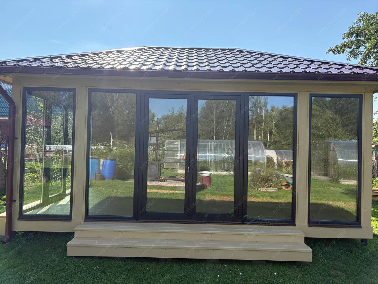 Раздвижная алюминиевая система. Окна в бронировочной пленке. Цвет пластика белый или коричневый.