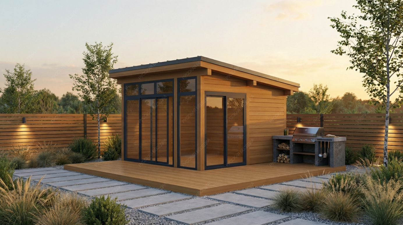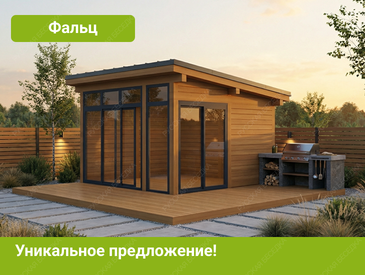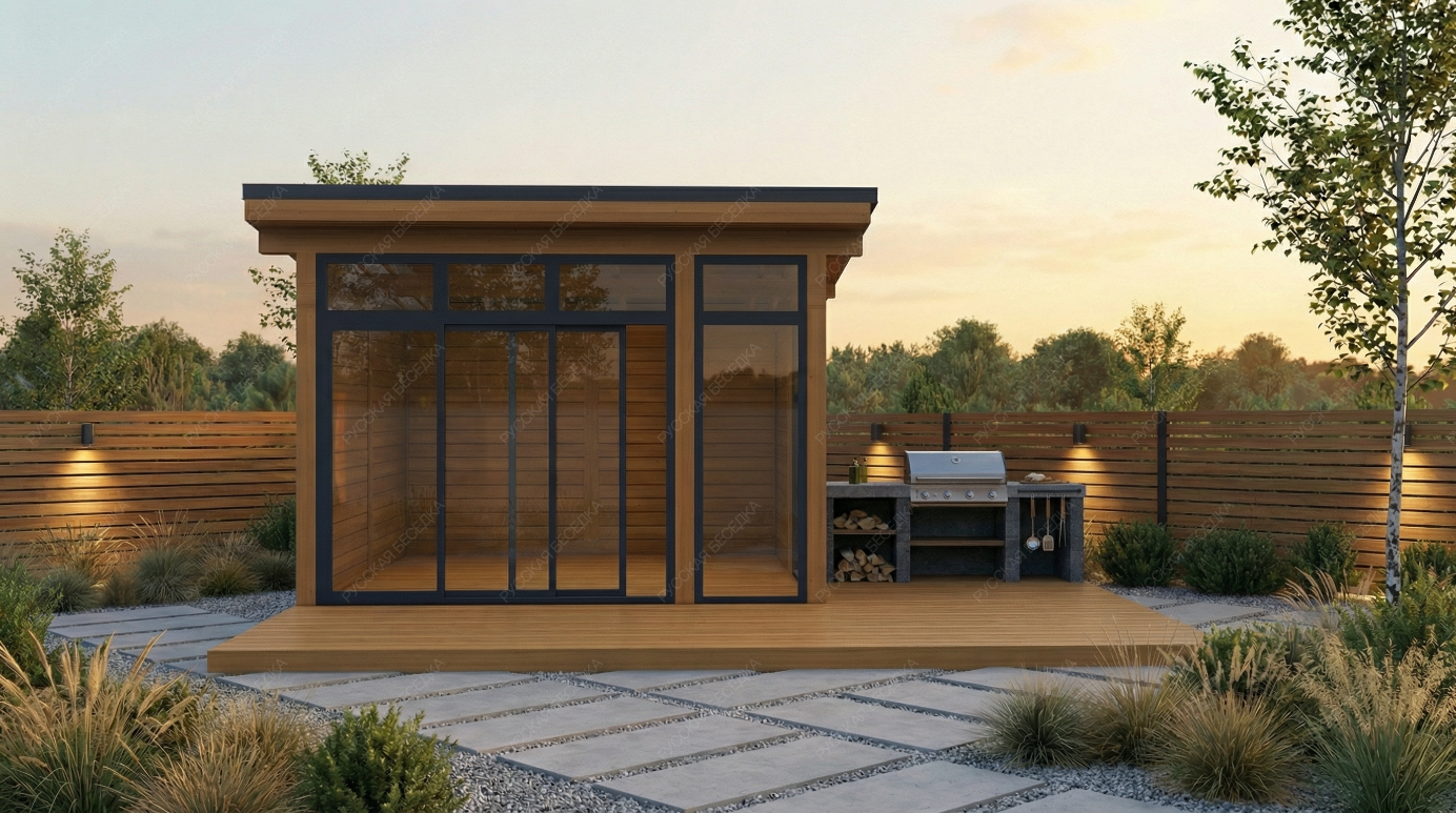Конструкция выполнена из массива хвойных пород (ель, сосна) камерной сушки и клееного бруса — материалов, прошедших стабилизацию и сохраняющих геометрию в условиях перепадов влажности. Панорамное остекление на базе раздвижной алюминиевой системы с окнами в бронировочной пленке обеспечивает беспрепятственный обзор и защиту от ультрафиолета. Односкатная крыша с фальцевым покрытием из металла гарантирует абсолютную герметичность, долговечность и эстетическую лаконичность.